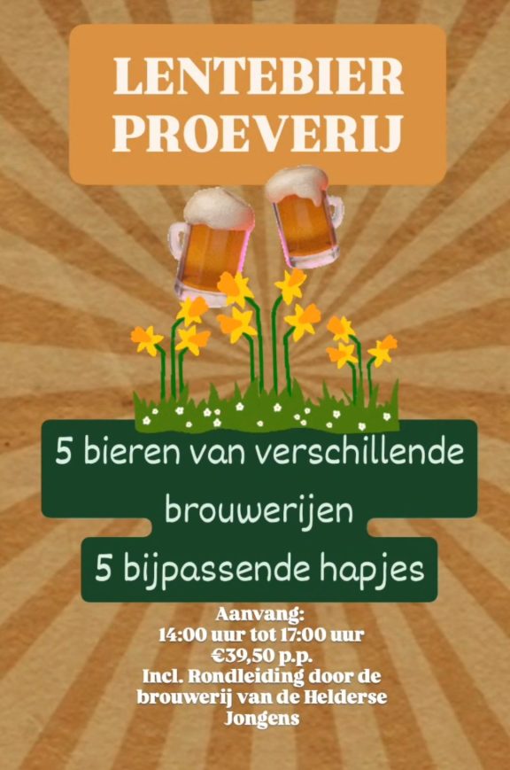 Om de zondag te in te kleuren, hebben wij onze 4e bierproeverij gepland voor jullie! We zetten de voorjaarsbieren in het zonnetje! Denk aan frisse lentebieren en stevige lentebockbieren.